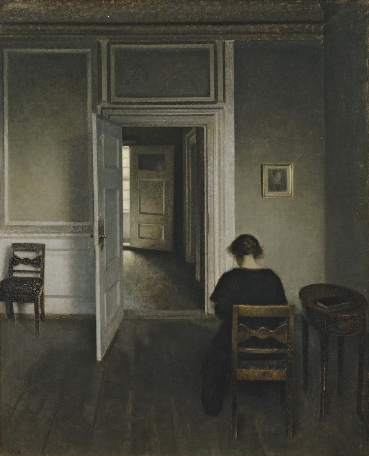 Vilhelm Hammershøi: Interiør med siddende kvinde, 1908. Olio su tela