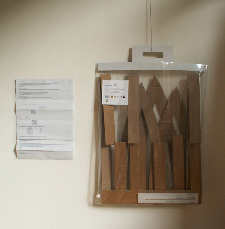 L’opera consiste in una busta di plastica 50 X 70 contenente una gabbia di cartone piegata e montabile. Nella busta ci sono due mollettine e due viti per il montaggio e il foglietto illustrativo (bugiardino).