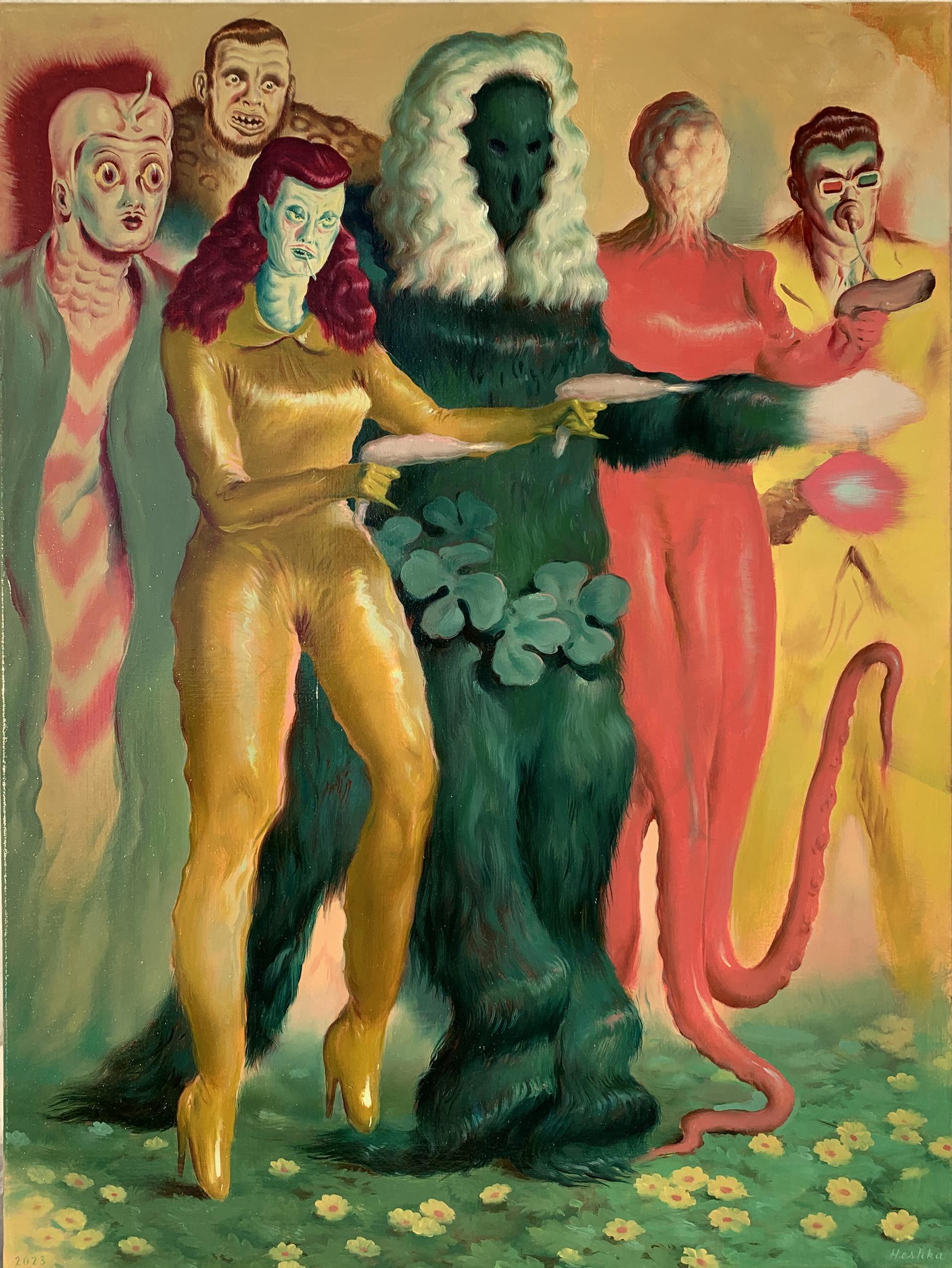La pittura dell’artista canadese Ryan Heshka si fa portavoce di un universo fantastico, un mondo folle e selvaggio popolato da pin-up mascherate, temibili femmes fatales, bizzarre chimere, mostri spaziali, supereroi e subumani: variazioni genetiche di ogni sorta, incroci, innesti, ibridi di un’umanità mutata – forse sopravvissuta alla catastrofe prodotta da una singolarità tecnologica – ma anche di una fauna e di una flora riadattate a nuove condizioni di vita. Condizioni che producono una variopinta gamma di forme organiche, un campionario di specie promiscue e spurie che incarnano il sogno darwinista di un’evoluzione inarrestabile. Per dirla con le parole di Ryan Heshka, “la prima generazione di nuove forme di vita, dopo la fine del mondo”. (dal comunicato stampa)