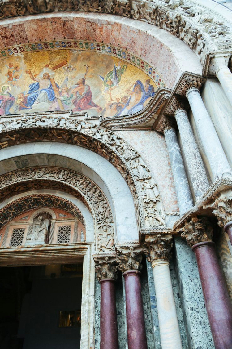 La Basilica di San Marco ha una pianta a croce greca con cinque cupole e con porte d’ingresso che ricordano archi di origine orientale. Tutte le decorazioni, le colonne, i marmi e le sculture ricordano i Palazzi di paesi lontani.