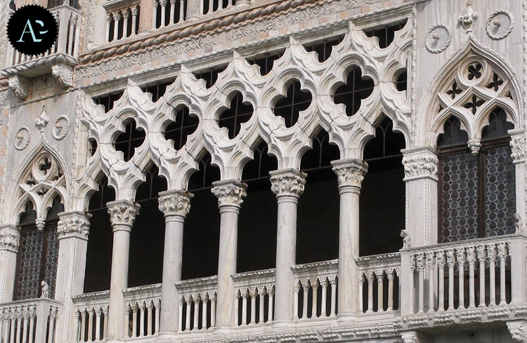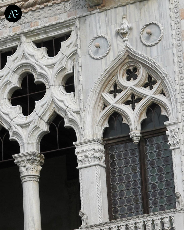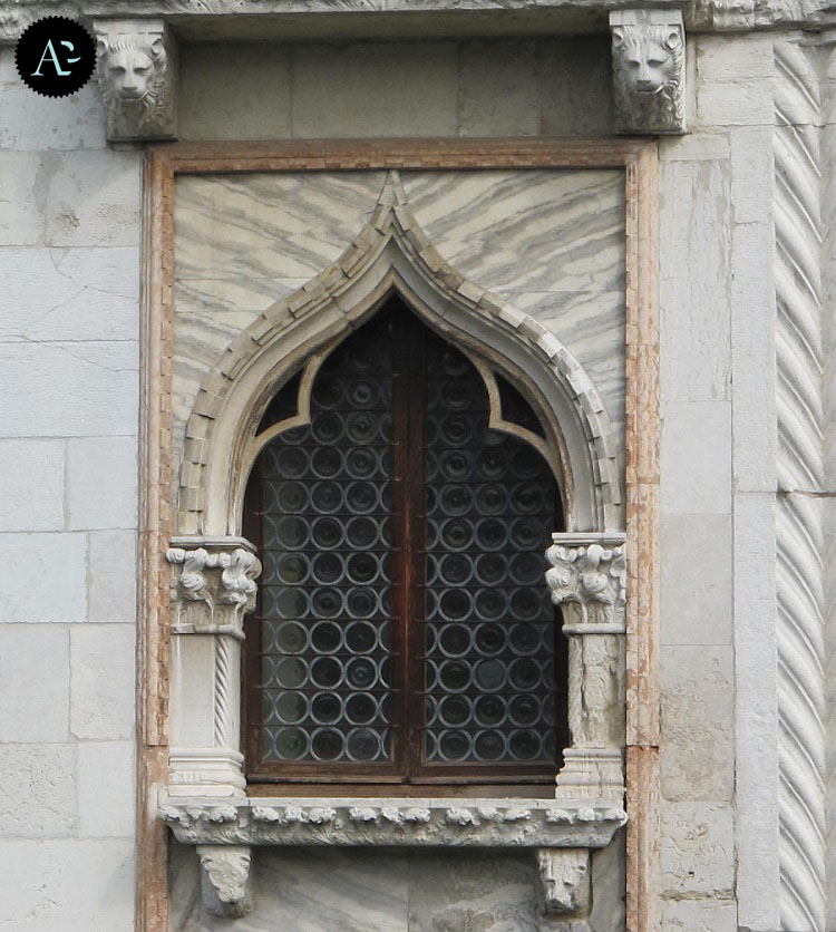 Le forme del traforo del primo piano e la fascia merlata in alto sono simili anche a Palazzo Ducale, poiché è proprio di questi anni la sistemazione della parte esterna del Palazzo dei Dogi così come è giunto a noi.