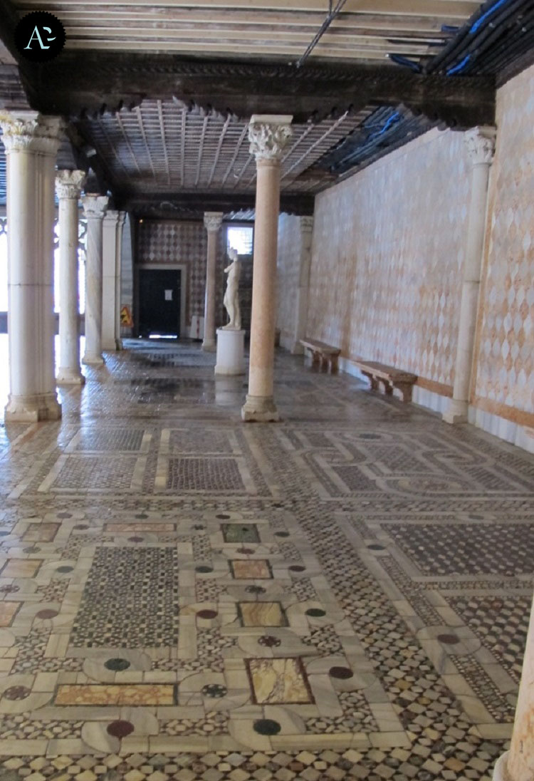 Franchetti seguì personalmente i lavori e si premurò di recuperare i materiali originari e più nobili. Ad esempio ricomprò da un antiquario parigino la vera da pozzo, che poco prima della vendita fu rimossa. Decise anche di abbellire il portico al piano terra e realizzò un mosaico pavimentale, probabilmente su un disegno da lui stesso creato e ispirato ai motivi geometrici medievali visti nella Basilica di San Marco e nella Cattedrale di Torcello. I materiali di cui è composta la pavimentazione provengono da marmi antichi di colonne e vasche comprate a Roma e in altre città, poi fatte tagliare appositamente da artigiani che ne ricavarono delle tessere, che lo stesso barone posò.