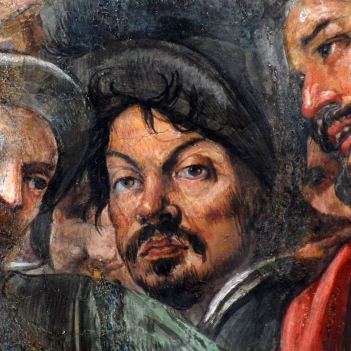 C’è infatti un volto di uomo, con baffi e pizzetto neri, che sporge tra due figure al centro della scena e che ha i tratti riconoscibili del Caravaggio.