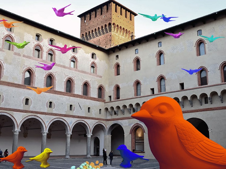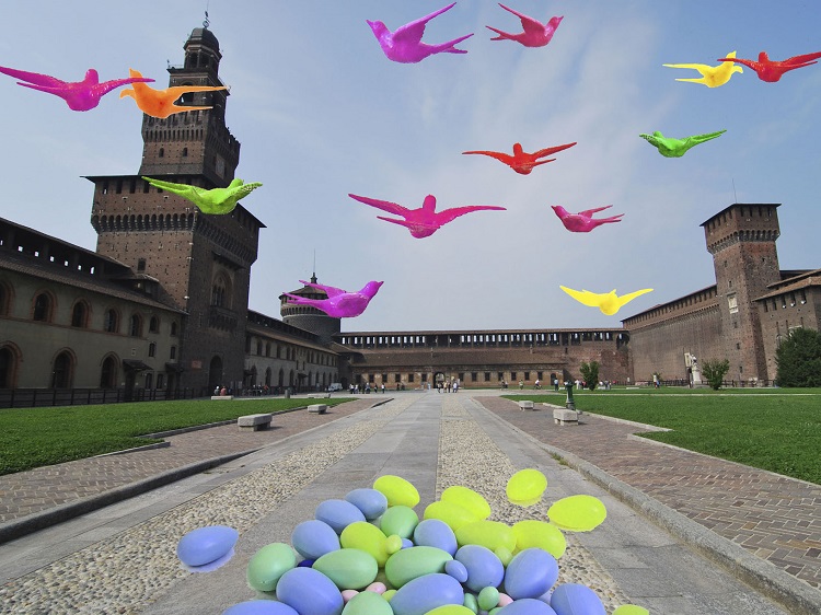 First we were amazed with the multicolored snails among the spiers of the cathedral and the frogs on the canals. Now the Cracking Art Group goes into action with the symbol of spring and freedom: the swallow. On April 10 from 11:30 a flock of swallows colored invade the Castello Sforzesco and a series of giant eggs and multicolor take place in different areas of the castle. The art project is called “Swallows Nest” and is part of the Spring Exhibition in Milan. Visitors can participate in “Lay an egg, do you revive a monument” by buying at the booth set up by Italian Nostra, a small sculpture Multiple swallow and deposit an egg into the ditch and will be able to support the Milanese heritage, in particular the restoration of the Equestrian Statue of Bernabo Visconti. The swallows Cracking Art enliven the city until June 30, 2014. – (English translation powered by Google).