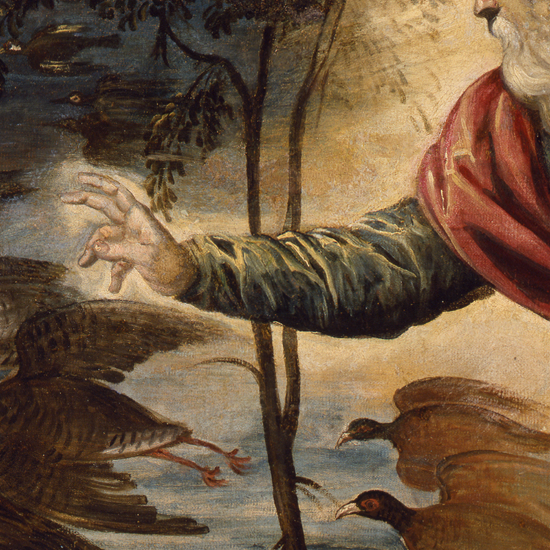 L’opera di Tintoretto, conservata presso le Gallerie dell’Accademia di Venezia, descrive Dio nel quinto giorno della creazione del mondo che benedice i pesci nel mare e gli uccelli nel cielo, appena creati.