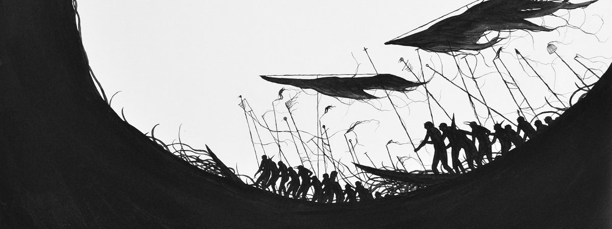 Attraverso un linguaggio stilistico minimale, e contrassegnato dall’uso monocromatico del nero, David de la Mano arriva a creare opere estremamente poetiche. Le singole figure diventano massa all’interno di uno spazio fatto di sogni, ambizioni, paure, vizi, speranze, conflitti interiori.