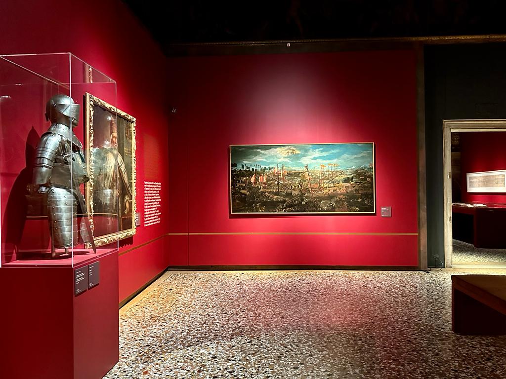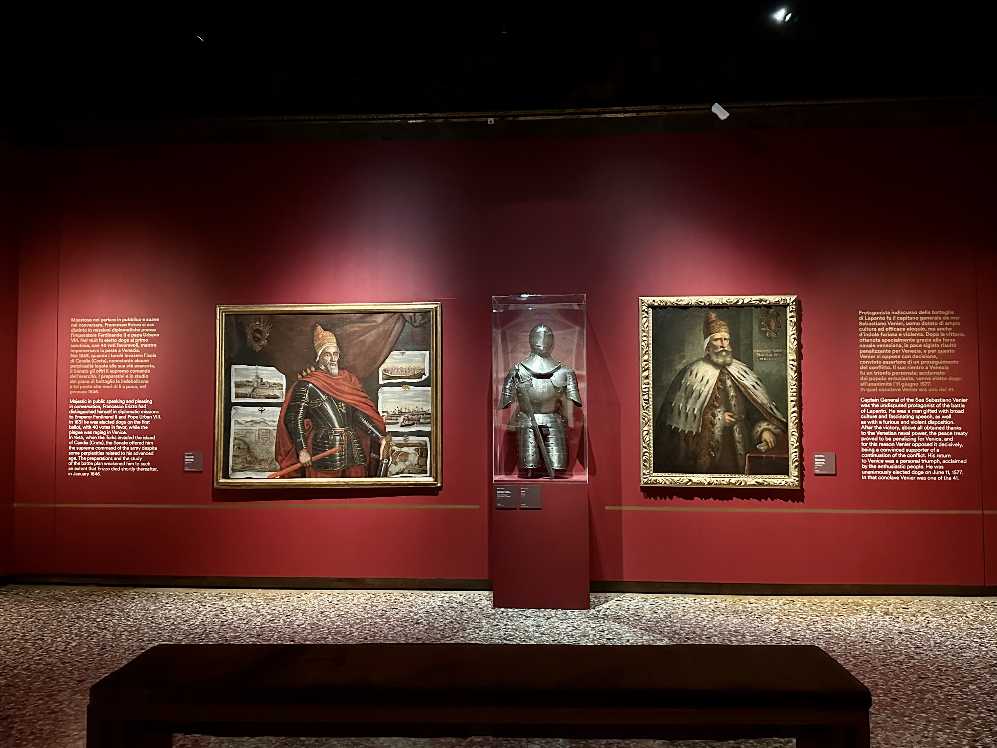 Il percorso espositivo inizia con l’elezione del doge e vengono, quindi, presentati gli strumenti, il metodo e i simboli dell’elezione stessa, arricchiti da aneddoti come il più lungo conclave e le tradizionali cerimonie di incoronazione. Successivamente, nella Sala Grimani, si affronta il tema della diplomazia e dei rapporti internazionali, fondamentali per la salvaguardia e la prosperità di Venezia. Proseguendo, ci si immerge in alcune delle battaglie più importanti combattute dai veneziani, concentrandoci sulla vita del doge durante questi eventi, come Sebastiano Venier nella battaglia di Lepanto nel 1571 e Francesco Erizzo all’inizio della guerra di Candia (Creta). Una sala successiva racconta la famosa cospirazione di Baiamonte Tiepolo, che portò alla creazione del potentissimo Consiglio dei Dieci, un organo nato per prevenire ribellioni e attentati contro lo Stato. Nella sala seguente, si esplora il ruolo del doge come committente e mecenate delle arti. Nei successivi spazi, si scoprono gli aspetti più principeschi della vita del doge: il rapporto con la dogaressa, le feste e le cerimonie che scandivano il calendario della Serenissima. Durante il percorso si ha modo anche anche di affrontare il tema degli abiti indossati dal doge e dalla dogaressa nel corso dei secoli, che testimoniano l’origine bizantina dell’istituzione dogale e la trasformazione del doge in un “Serenissimo Principe”.