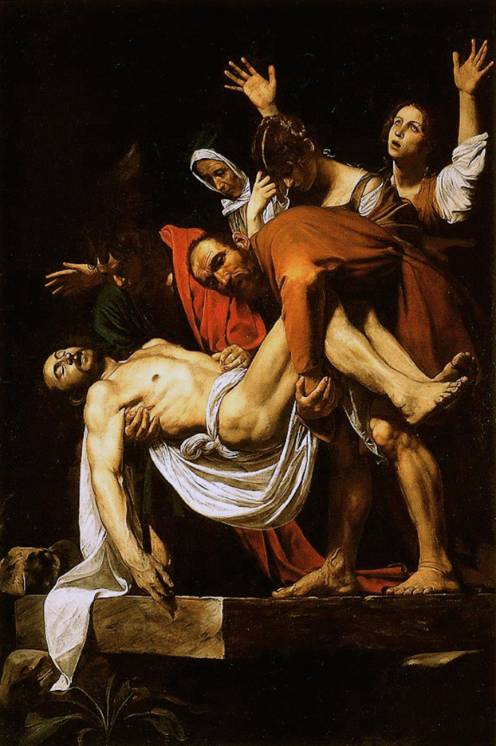 Nella Deposizione di Caravaggio il corpo di Cristo è sostenuto da San Giovanni e Nicodemo. Maria, la Maddalena e una donna con le braccia alzate si trovano alle loro spalle disposte secondo uno schema a piramide.