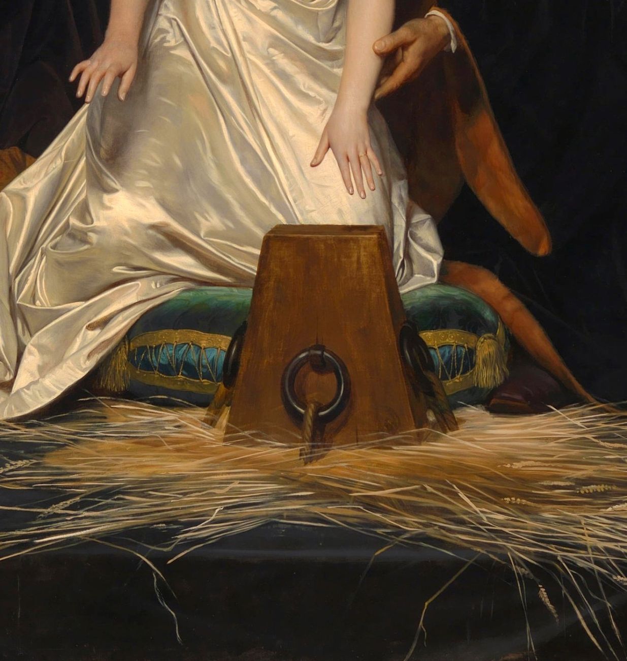 Delaroche descrive sulla tela il momento fatale che precede l’esecuzione di Jane Grey, cogliendo la commozione e la tragica bellezza di questo momento storico.