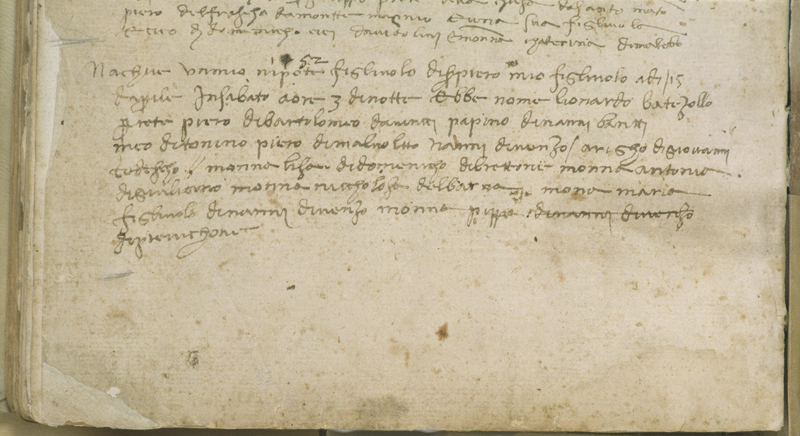 Atto di Nascita e di Battesimo di Leonardo da Vinci – 15 aprile 1452, registro cartaceo, Notarile antecosimiano, Archivio di Stato di Firenze. L’annotazione relativa alla nascita e al battesimo di Leonardo fu stilata dal nonno Antonio sull’ultima carta del protocollo notarile del proprio padre, il notaio ser Piero di Guido da Vinci.