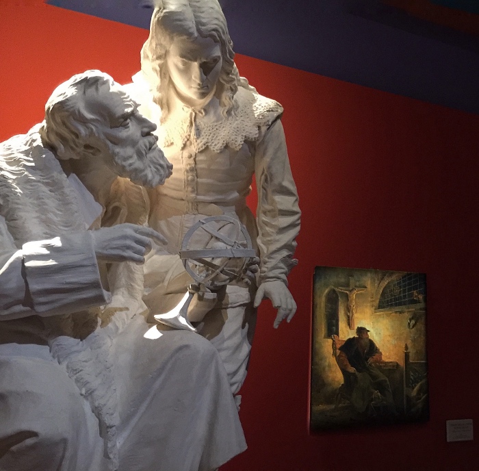 Il bozzetto in gesso di Galileo Galilei e John Milton realizzato da Cesare Aureli (1843-1923) che evoca l’incontro tra il poeta inglese Milton, in Italia tra il 1638 e il 1639, e Galileo Galilei durante il periodo in cui lo scienziato era confinato nella villa il Gioiello di Arcetri, dove trascorse la sua esistenza dopo la condanna del 1633.