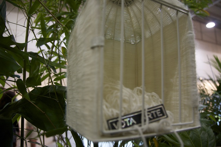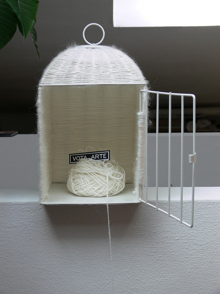 La gabbietta che presento, di metallo laccato di bianco, completamente rivestita di lana bianca, tranne lo sportellino, l’ho concepita come “Habitat ideale” per il messaggio che promuovo da anni: VOTA ARTE.