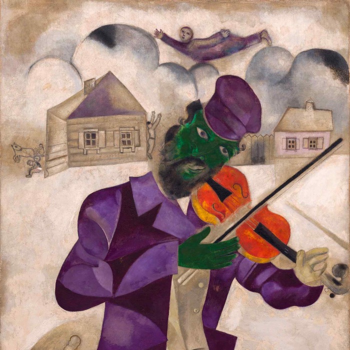 Chagall sceglie il violinista per rappresentare la musica. Lo dipinge sospeso per aria, con il volto e la mano che tiene l’archetto di un verde intenso, mentre sullo sfondo si vede un paesaggio che sembra uscito da un sogno.