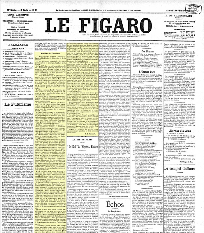 La pubblicazione avviene su Le Figarò ad opera di Filippo Tommaso Marinetti e il documento è l’annuncio dell’inizio di una battaglia contro tutto ciò che era tradizionalismo ed era in netto contrasto con la cultura romantica ottocentesca.