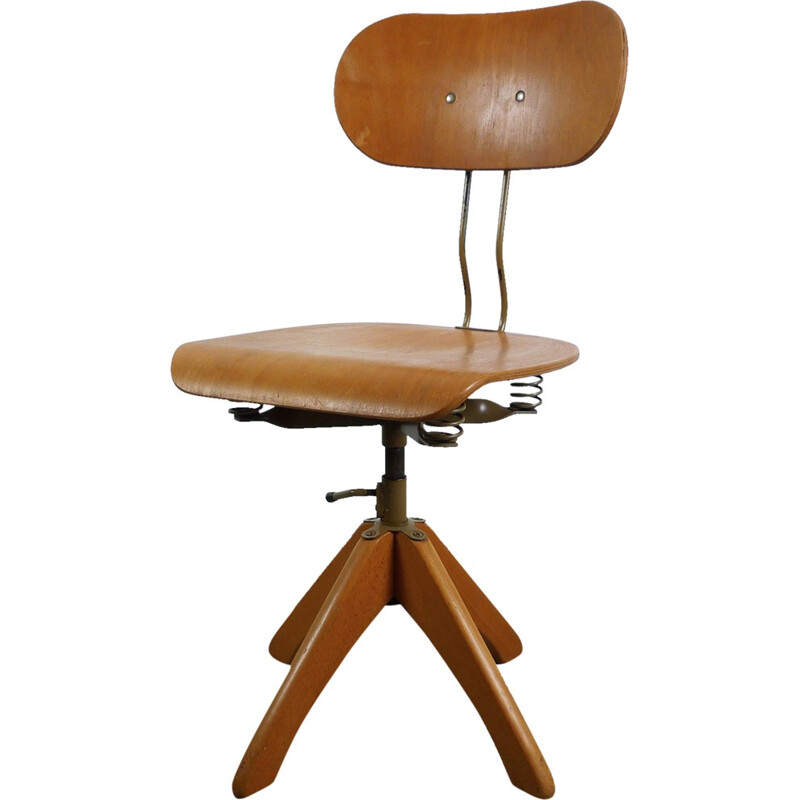 La sedia industriale di Margarete Klöber ha un sedile e uno schienale realizzati in legno di faggio laminato, i piedi in massello di faggio e il resto della struttura è in metallo.