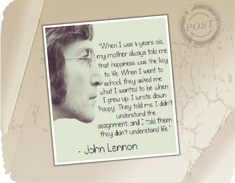 “Quando avevo 5 anni, mia madre mi disse che la felicità è la chiave della vita. A scuola mi dissero cosa volevo essere da grande. Io scrissi “felice”, mi dissero che non avevo capito l’assegnazionee io risposi che non avevano capito la vita” – John Lennon