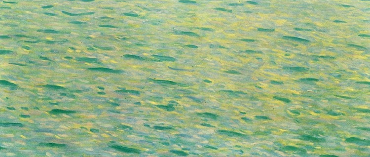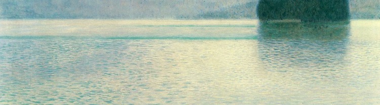 L’insolito formato quadrato che caratterizza queste opere, se da un lato ne mette in risalto il carattere decorativista, dall’altro accentua il loro essere pura pittura. In “Isola sull’Attersee”, l’orizzonte altissimo permette all’artista di concentrarsi quasi esclusivamente sulla resa dell’acqua.