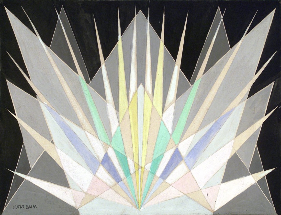 Questo corpus di lavori, nato nel 1912 durante un soggiorno a Düsseldorf, rappresenta un’audace esplorazione delle geometrie astratte, influenzate dalla rifrazione luminosa. Balla, attraverso una serie di esercizi accurati, riuscì a catturare l’essenza cangiante della luce, traducendola in colori vibranti che vanno dal rosso al violetto, delineando così l'”anatomia” della luce attraverso forme geometriche.