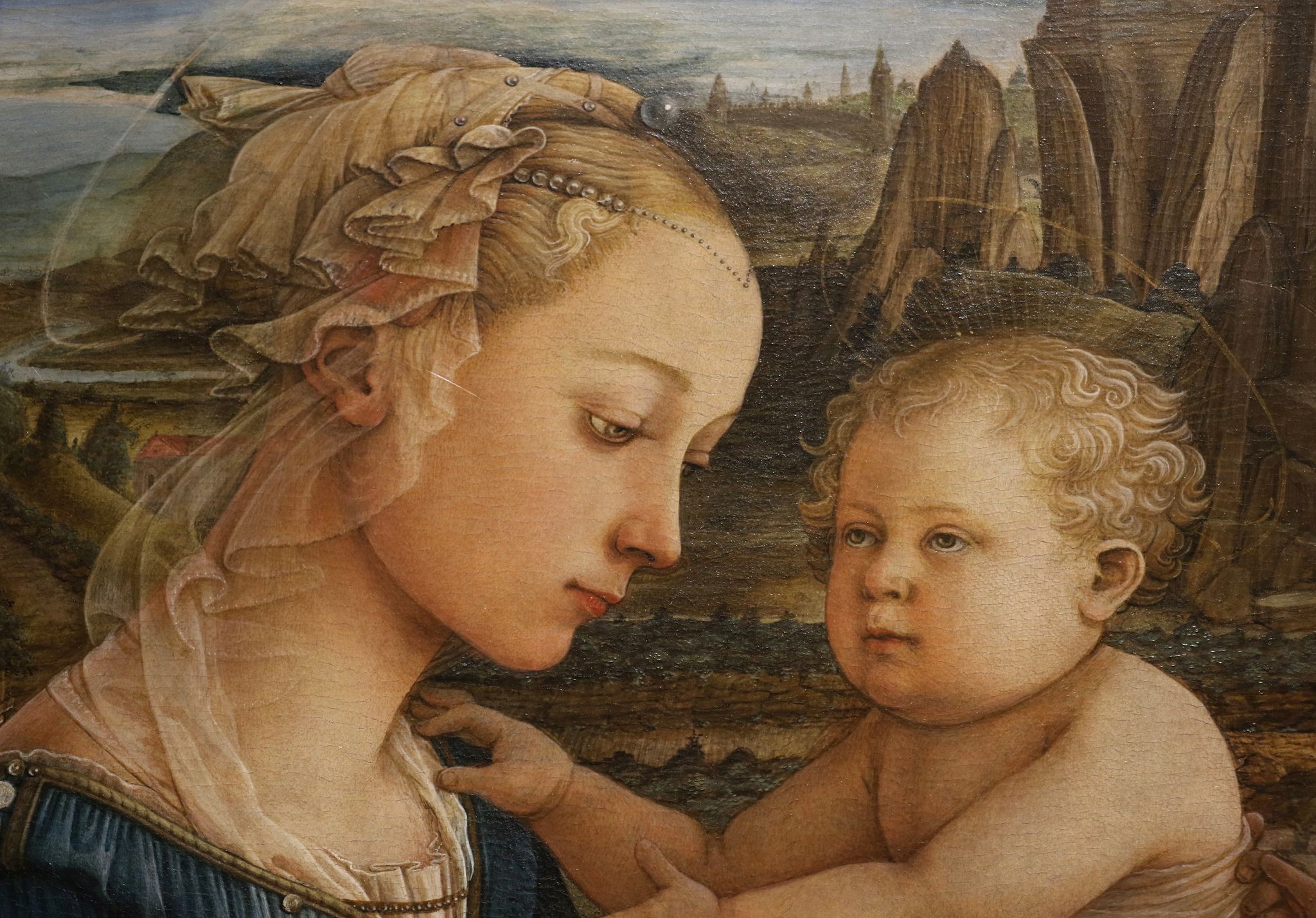 Lippi utilizza la luce e l’ombra per creare profondità e realismo, dando vita alle figure e al loro mondo circostante. La delicatezza con cui la Madonna guarda suo figlio, con un misto di gioia materna e comprensione, cattura l’essenza della maternità e della spiritualità. I due angeli, uno dei quali sorridente e coinvolgente, aggiungono una dimensione celeste e giocosa all’opera, contrastando con la malinconia appena percettibile negli occhi della Madonna.