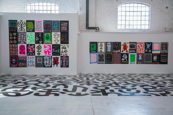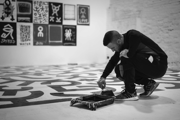 L’intervento site-specific che caratterizza NOMADIC SIGNS è la grande installazione pavimentale, in cui gli oltre 200 mq dello spazio di One Contemporary Art si trasformano in una tela bianca in cui l’artista ha immerso se stesso, fino a comporre un mosaico di simboli, un alfabeto segnico, con la gestualità istintiva e la potenza primitiva tipica di chi utilizza la pittura per rendere concreta un’emozione.