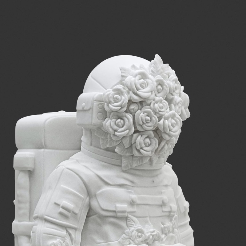 Nella serie “Swaddle”, attraverso la fusione di bende e corde con parti anatomiche, le opere si ergono come un grido di sfida e un inno alla lotta per la libertà. In “Flowered Soul” è la natura che ci ricorda della sua esistenza facendosi “strada” attraverso i corpi e la tuta da astronauta degli Spaceman: la vita è qui e non altrove!
