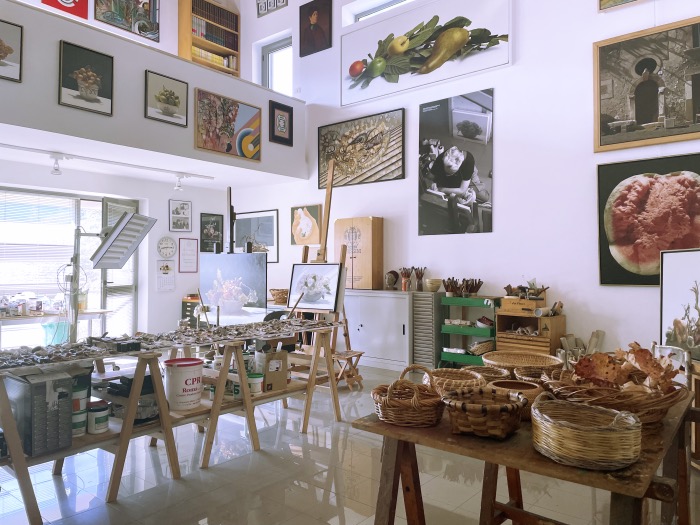 Si tratta di un vero e proprio laboratorio di sperimentazione attraversato da un tavolo di diversi metri interamente ricoperto da una collezione di colori a olio provenienti da ogni parte del mondo, tra cui moltissimi ormai rari e fuori produzione.