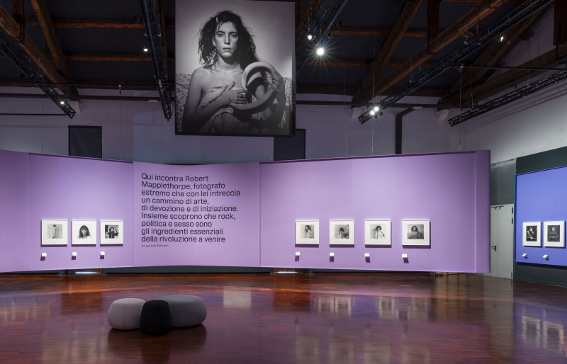 Le pareti della mostra sono vestite con una pittura speciale, “Antartica”, firmata da San Marco, un’azienda che conosce bene il valore dell’arte e che qui ha fatto le cose in grande. Le sfumature cromatiche accompagnano le varie tappe dell’esposizione: si comincia con un rosa salmone che ti accoglie come un invito delicato, si passa al lavanda che diventa via via più intenso fino a farsi blu profondo, per poi esplodere in un rosso intenso nella sezione più potente della mostra. Quella dove Mapplethorpe gioca con la statuaria classica e la reinterpreta in chiave contemporanea.