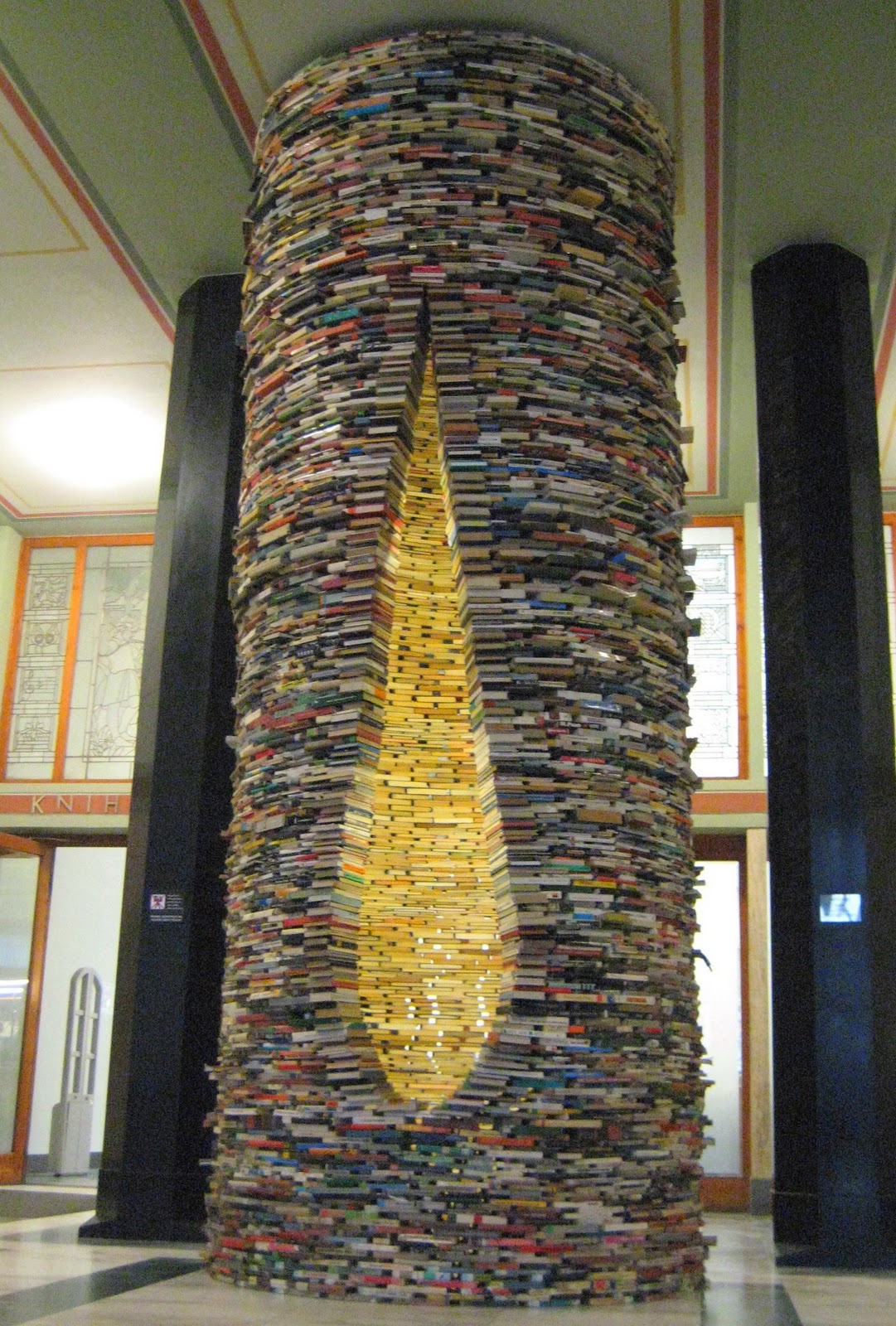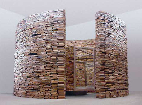 Matej Krei with this technique creates houses, towers, mazes and environmentsmade of books where you feel immersed.