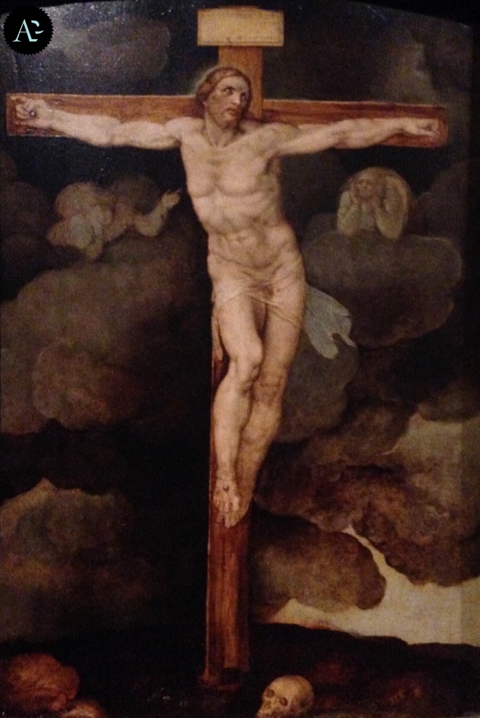 Il Professor Puppi, inoltre, sottolinea come le dimensioni della tavoletta sono molto simili al disegno conservato a Londra. Mentre tracce di spolvero (la tecnica che permette di trasferire un disegno su varie superfici) precisano la sua derivazione da una matrice grafica (sempre il disegno del British Museum) e l’analisi ai raggi infrarossi ha rivelato come il posizionamento del teschio, alla base della croce nel disegno, originariamente fosse stato tracciato alla destra di essa come nel dipinto in mostra.