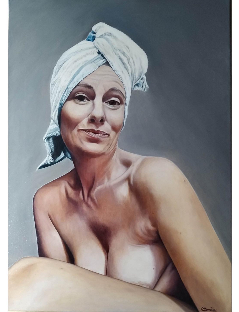 Ho dipinto Valeria quasi per gioco, su sua stessa richiesta. A dire il vero, inizialmente non ero del tutto convinta: non pensavo che avrei realizzato un dipinto di quel genere. Ma una volta iniziato, qualcosa è cambiato. Quel volto, quel corpo, quella posa semplice e naturale mi hanno subito catturata. Non era solo un ritratto, era una personalità che prendeva forma sulla tela. La posa, apparentemente rubata ma in realtà attentamente composta, unita all’assenza di sfondi o ornamenti, riportava l’attenzione su ciò che più conta: la persona. Il corpo è mostrato senza pudore, ma anche senza ostentazione, solo rispetto, dignità e libertà. Forse è proprio questa autenticità che ha colpito anche chi l’ha vista: Valeria è diventato uno dei miei ritratti più apprezzati sui social, salendo rapidamente in vetta alle preferenze dei miei followers.