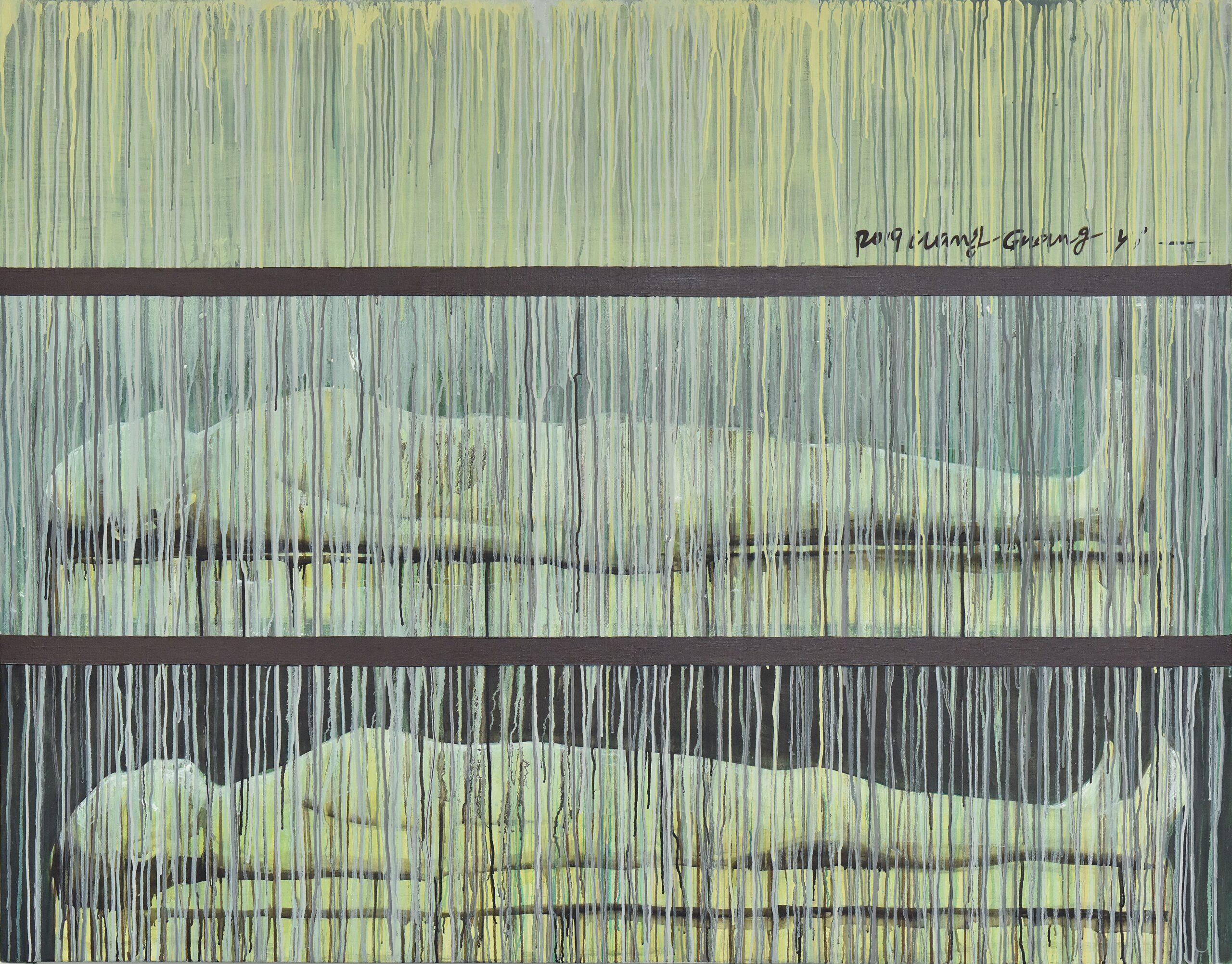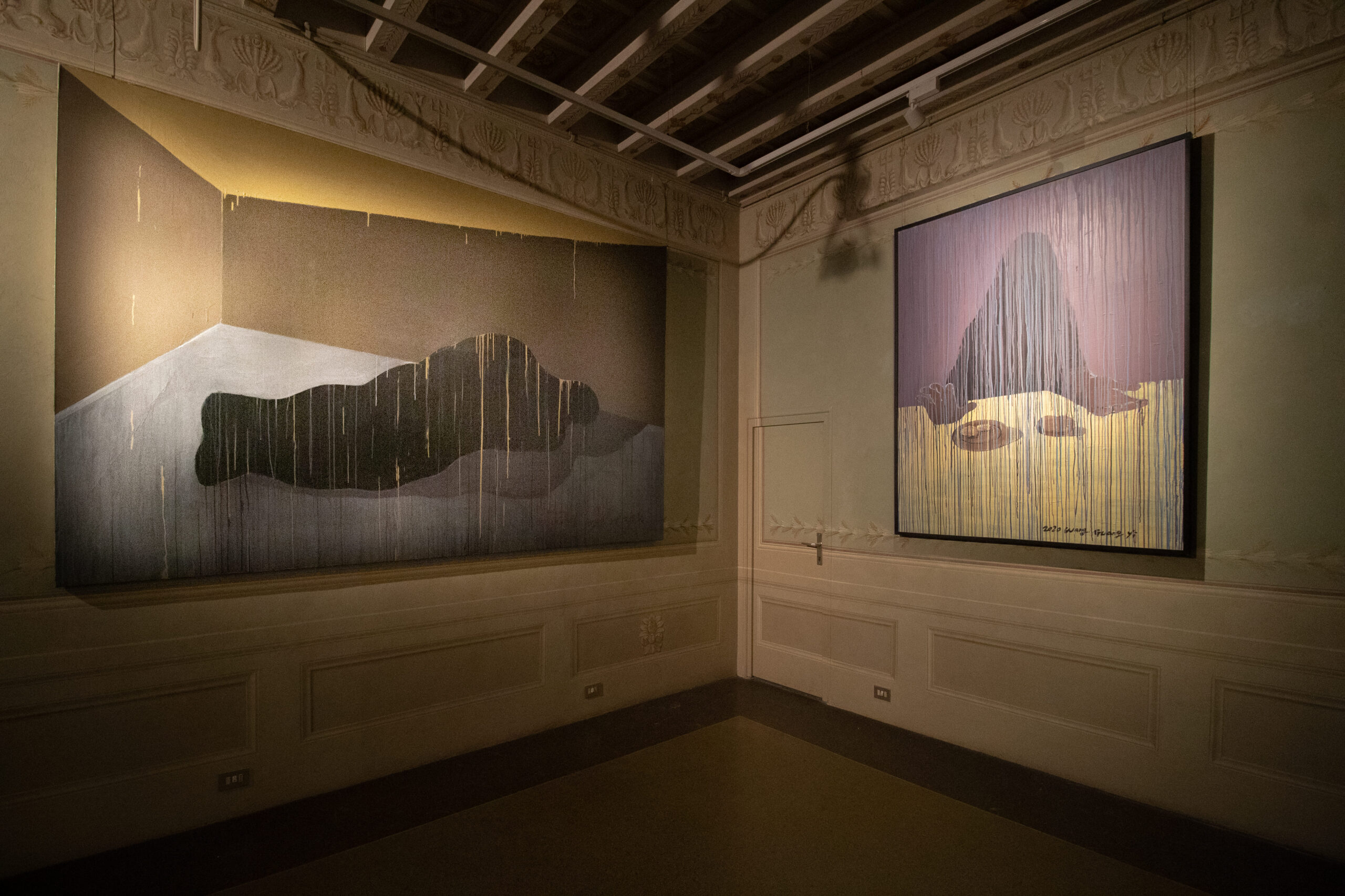 Il terzo ciclo, che dà il nome alla mostra “Obscured Existence”, è dove il tema raggiunge il suo apice. Utilizzando la tecnica pittorica cinese Wu Lou Hen, Wang Guangyi fa scorrere una pioggia di gocce su figure umane, trasformandole da ordinari a misteriosi e incomprensibili.