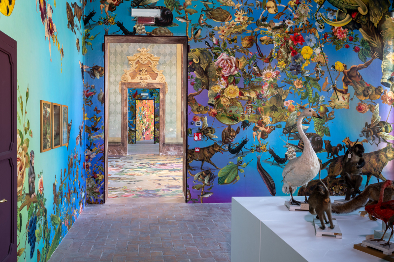 Il duo artistico californiano, meglio conosciuto come Fallen Fruit, ha trasformato un angolo barocco della città di Modena in una giungla visionaria, ma non aspettarti un’esplosione di colori fine a sé stessa. Ogni fiore, animale o carta dei tarocchi che vedi è un invito a pensare. A riflettere sulla biodiversità che stiamo perdendo, sul clima che cambia, e su quanto poco ci basta per rovinare tutto.