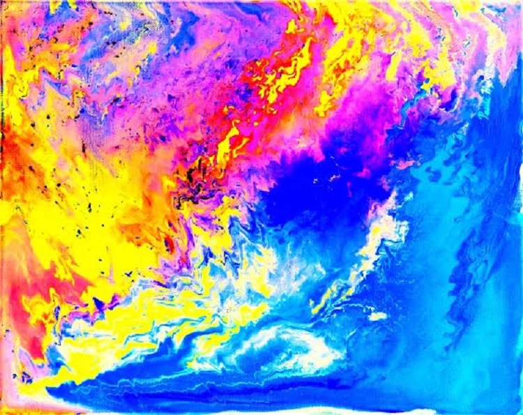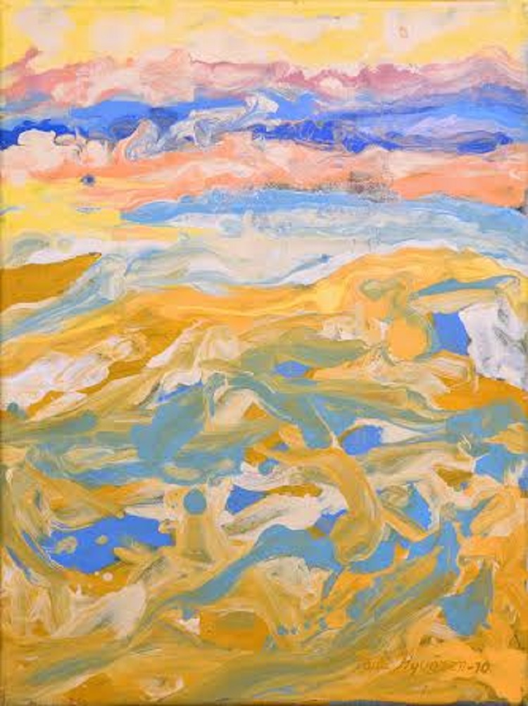 The painting of “Beautiful weather” expresses very bright and joyful colors throughout the piece of art work. I believe the title is perfect for this piece of work. The painting’s colors go really well together and I think that it creates a joyful picture. The way that the colors are blended and put together, I see the painting as a ocean wave with the sun beating down on the wave, creating the different colors of reds and pink. Overall this painting conducts a warm feeling for me and makes me want to go the beach. Without the vibrant colors I believe this piece would not be the same.
