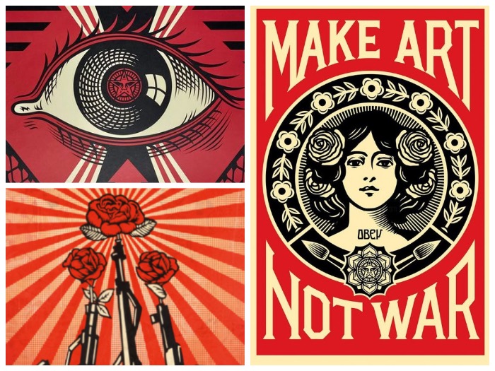 Con uno stile inconfondibile, ispirato dal Futurismo e dalle grafiche sovietiche dei primi del Novecento, Shepard Fairey attraversa la tradizione grafica dell’arte dissidente e avanguardista europea.