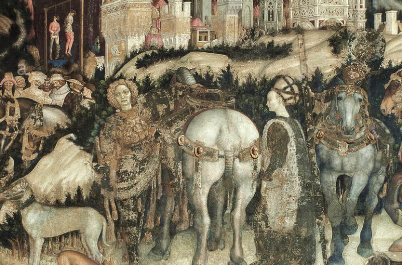 Le preziose decorazioni che possiamo ammirare sulle architetture ma anche sugli abiti dei vari personaggi ci ricordano che l’intera opera appartiene alla tradizione medievale del racconto cortese. In questo caso l’affresco di Pisanello è forse utilizzato per trasmettere un messaggio politico e allude alla minaccia turca nei confronti dell’Impero Romano d’Oriente.