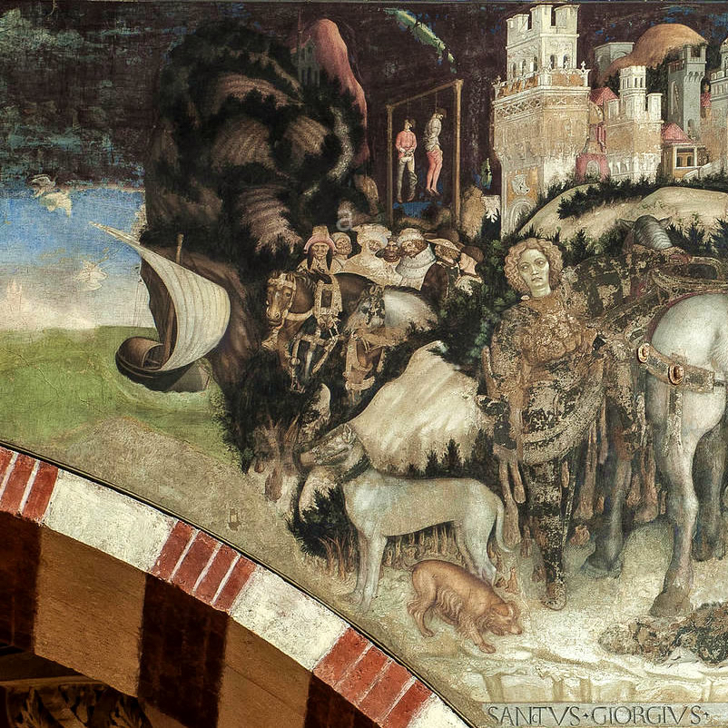L’affresco raffigura San Giorgio mentre sta per salire a cavallo per andare ad uccidere il drago, cui la principessa è destinata.