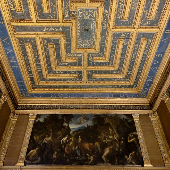 Se si alza lo sguardo si può ammirare il labirinto con all’interno il motto “forse che sì, forse che no”, tratto da una famosa frottola amorosa del Cinquecento e che allude all’incertezza della vita.