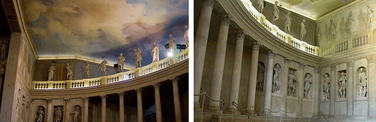 I suoi studi approfonditi dei testi di architettura di Vitruvio e la visione delle antiche rovine lo porta alla creazione di un ambiente che finge l’ambientazione all’aperto dei teatri classici.
