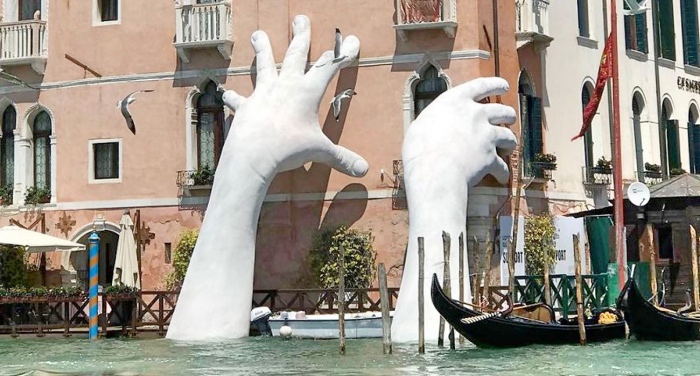 Caterina Art post Blog: Due mani enormi emergono dal Canal Grande e sorreggono un Palazzo. Che significato ha quest’opera?