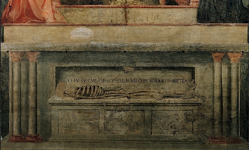 Al di fuori dello spazio di questa cappella immaginaria si trovano i ritratti dei due committenti in preghiera, un uomo e una donna di cui non è certa l’identificazione. Nella parte più bassa si intravede l’immagine di uno scheletro sdraiato su un sarcofago e si può leggere l’iscrizione: “IO FUI GIÀ QUEL CHE VOI SIETE E QUEL CHI SON VOI ANCOR SARETE”, che è un ammonimento a vivere la vita secondo i valori cristiani nella prospettiva della vita che verrà dopo la morte.