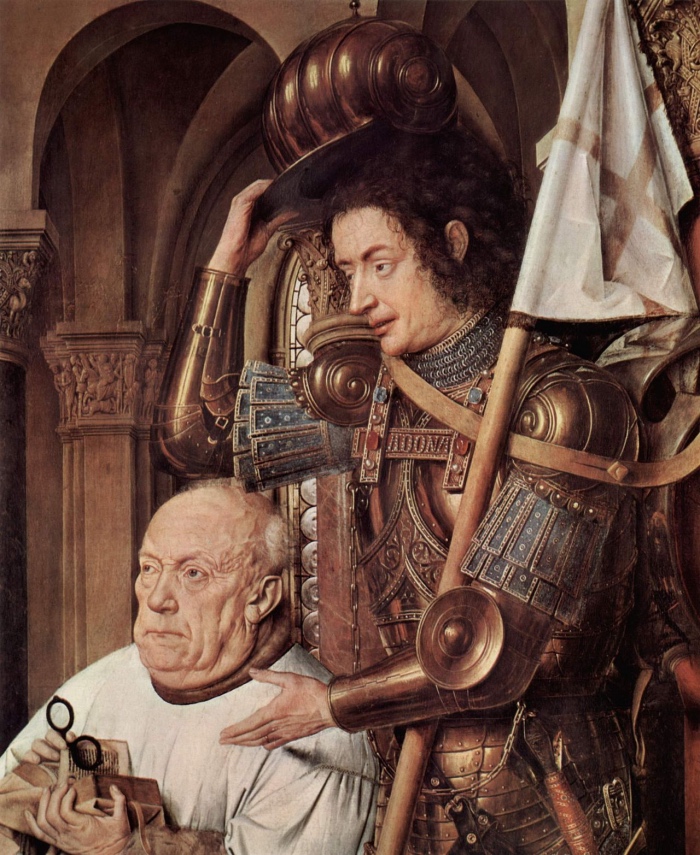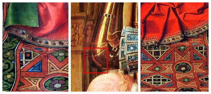 Se si osserva attentamente si nota che l’armatura di San Giorgio nasconde il riflesso di un autoritratto di Jan van Eyck, mentre dipinge con il suo turbante rosso in testa.